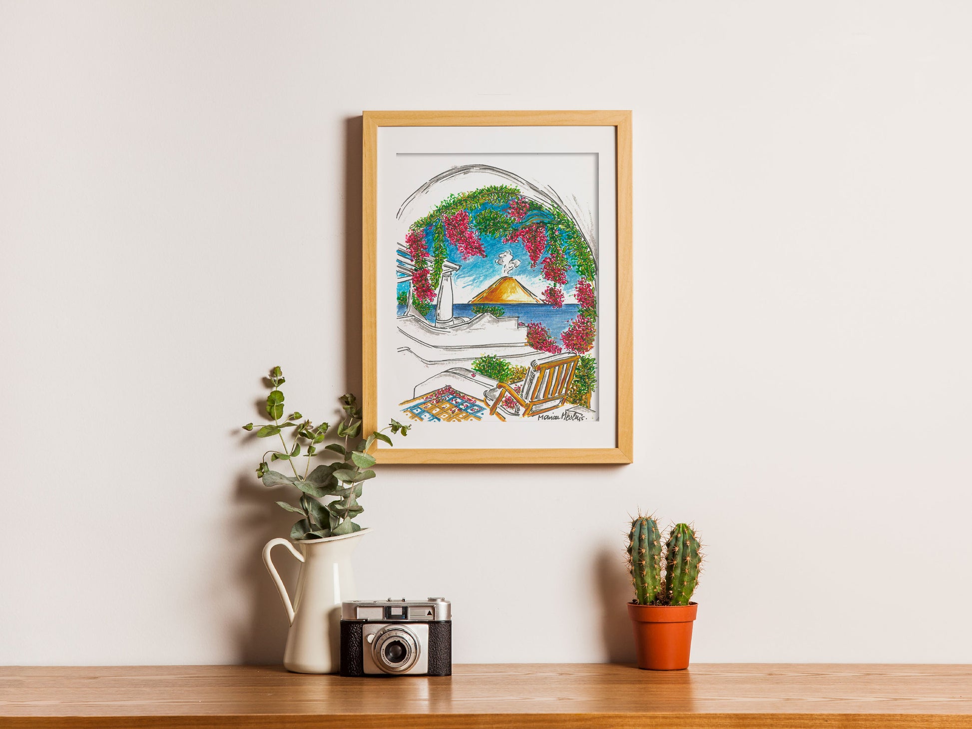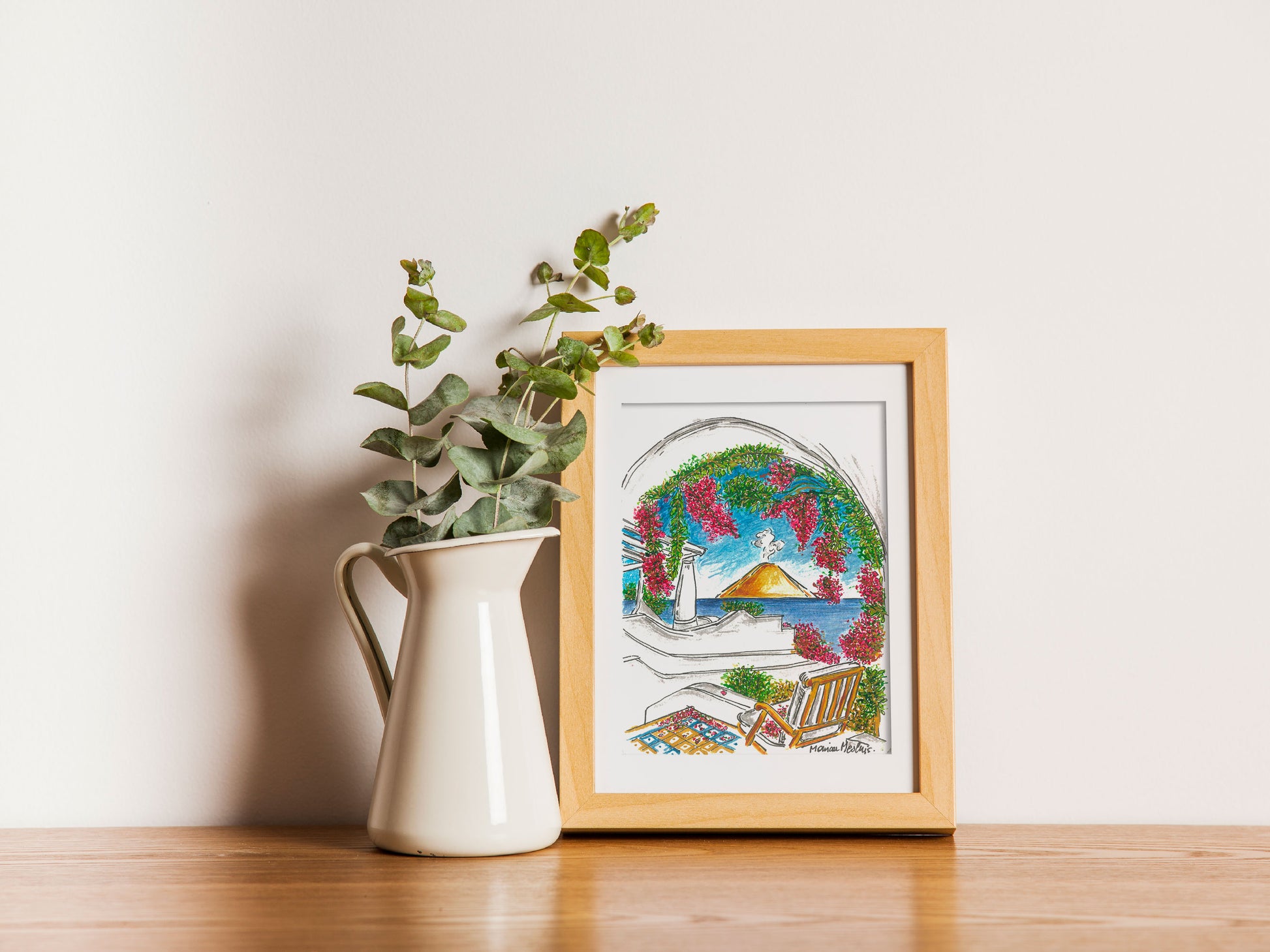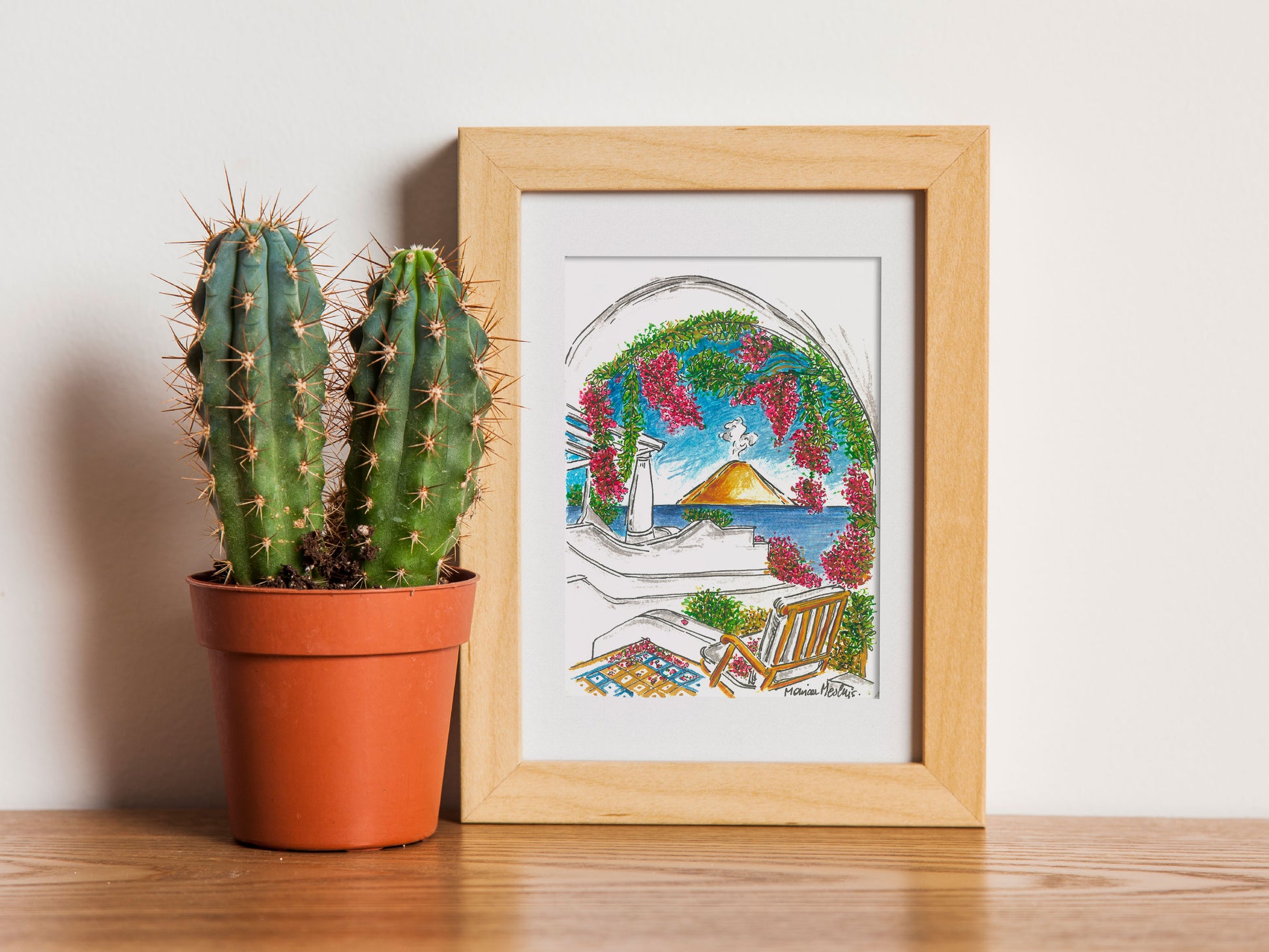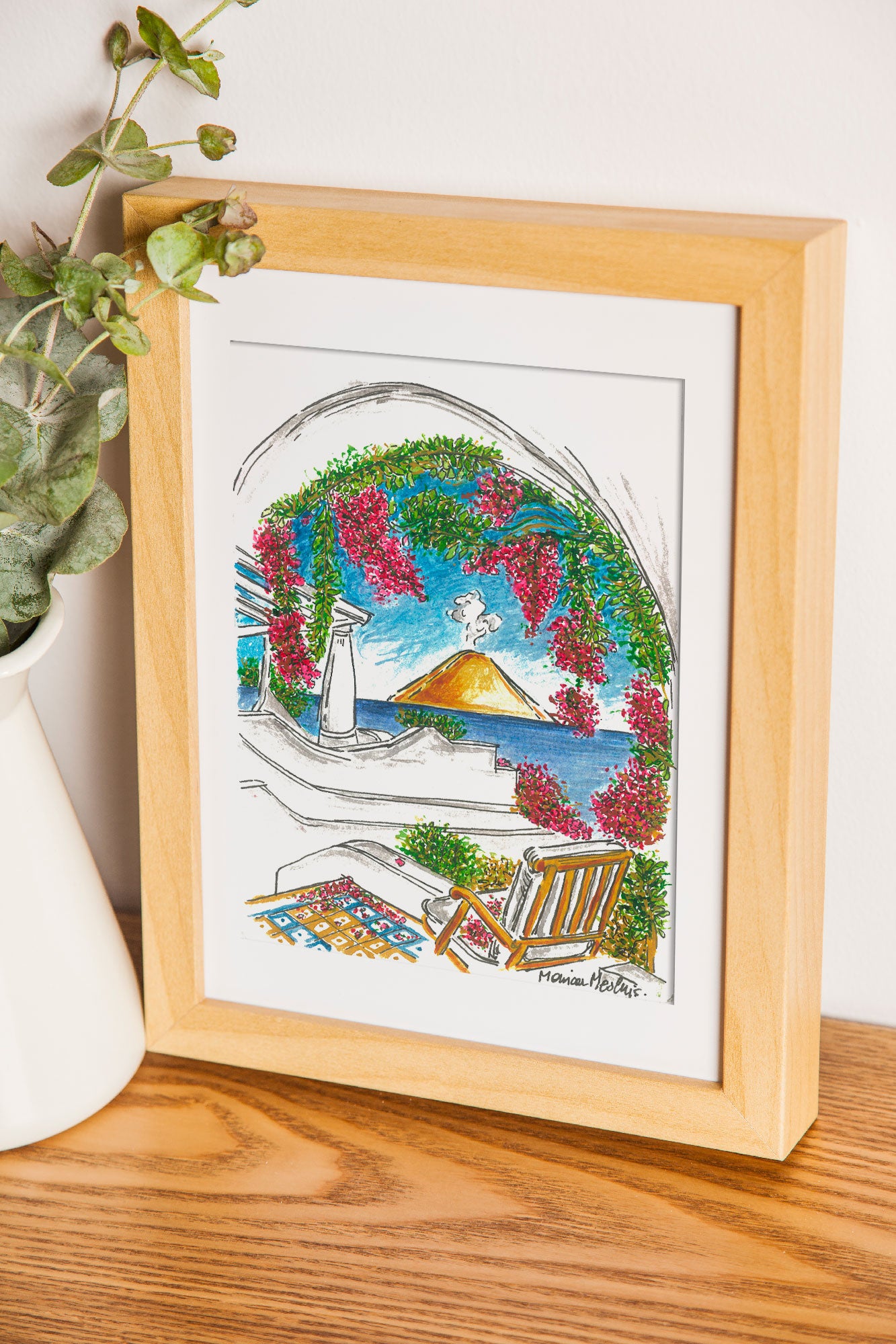 Tra il profumo intenso dei fiori e il blu profondo del mare, questo acquerello racchiude l’incanto delle Eolie. Una terrazza adornata di bouganvillea in fiore che si apre sull’orizzonte, dove Stromboli si staglia maestoso, regalando scorci di pura magia mediterranea e di bellezza eterna.